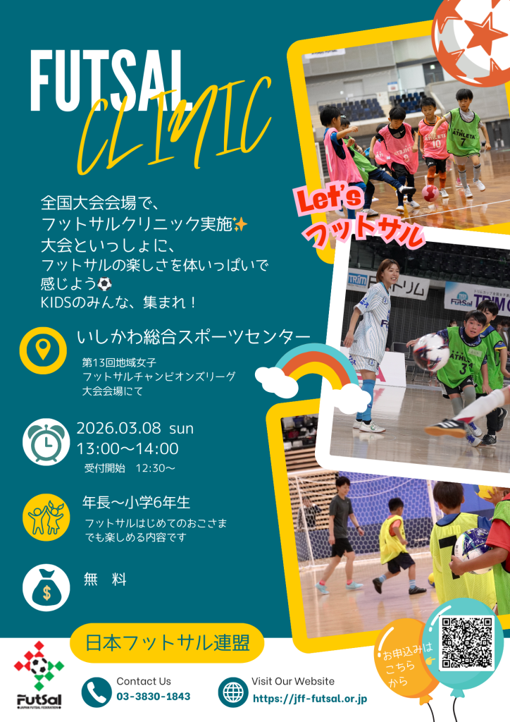 3月8日(日)、いしかわ総合スポーツセンターで開催される「第13回地域女子フットサルチャンピオンズリーグ」の会場で、年長から小学校6年生のお子さんを対象にした「KIDSフットサルクリニック」が行われます。